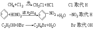 【定义】有机化合物分子里的某些原子或原子团被其它原子或原子团所代替的反应。例如: